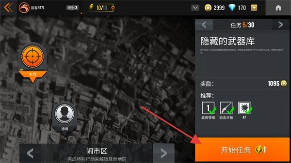 1、当接到【消灭穿红色夹克的人】这一任务时,点击【开始任务】按钮就能进入狙击场景开展任务。
