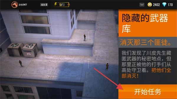 4、查看【隐藏的武器库】任务详情,目标消灭三个匪徒,点击【开始任务】进入狙击场景。