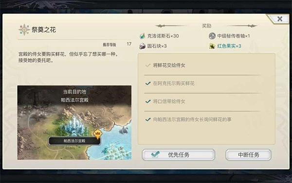 要接取祭奠之花的任务,我们得先去帕西法尔宫殿。任务流程是这样的:先向宫殿的侍女长打听鲜花相关的事,再把口信转达给侍女,之后去阿克托尔买花——买花时会出现三个选项,很多玩家都卡在这一步的选择上。