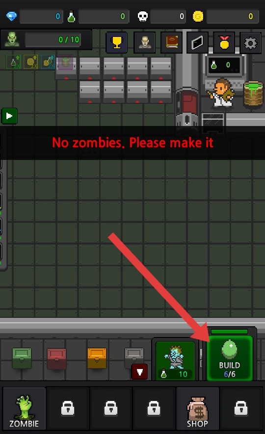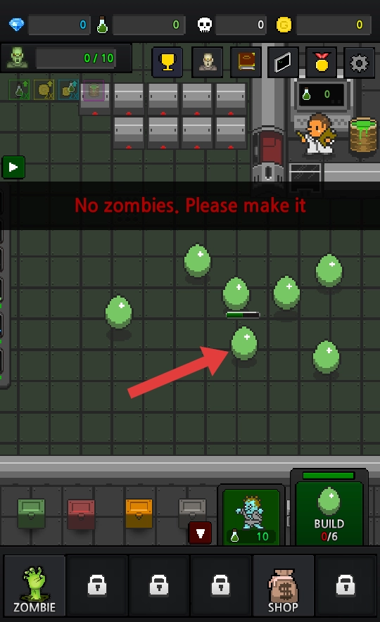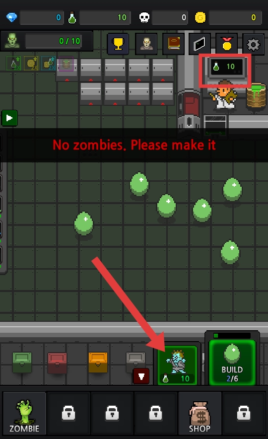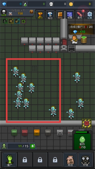 3、当上方红框内显示的【绿色液体】积累到所需数量(例如10)时,点击【僵尸】图标,消耗该资源来制造僵尸。