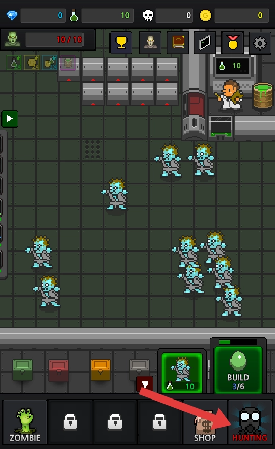 4、当成功制造出足够数量的僵尸(界面显示【10/10】)后,点击右下方的【HUNTING】按钮,即可开启僵尸狩猎相关玩法。