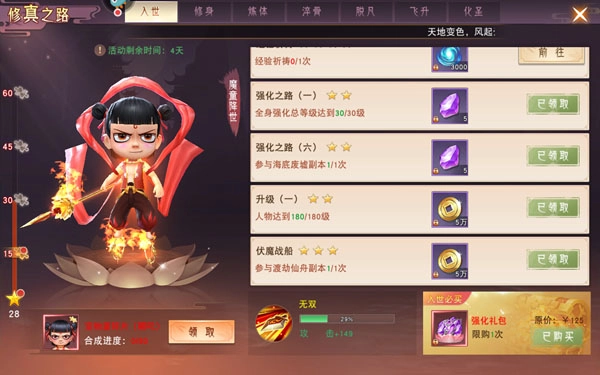 漫漫修真之路,每完成一项修真任务,还能领取相应奖励,活动时间有限,修真之事不可怠慢。