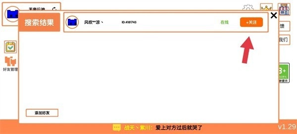 3、输入你朋友的id号进行搜索,然后点击关注。