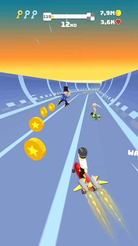3.收集系统内容多样:玩家能在赛道中获取金币、钥匙之类的物品,这些物品可用来解锁新角色、新滑板、新道具等,既提升了游戏的目标导向性与成就感,也促使玩家持续去探索和挑战。