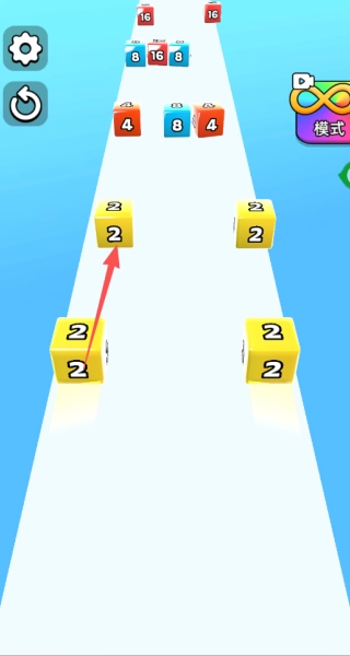 1、控制角色朝着数字相同的方块移动,像图里的“2”方块就能和前方同数字的方块合并,要提前规划好移动路线。
