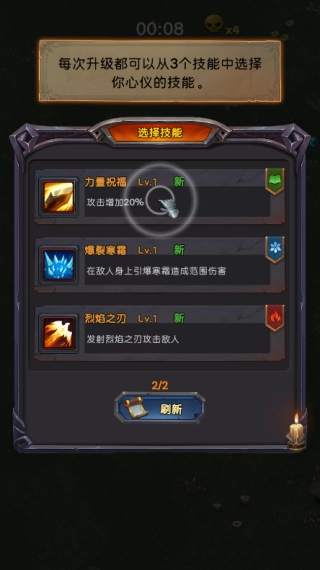 3、当经验值满升级时,可以从三个技能中选择一个技能;