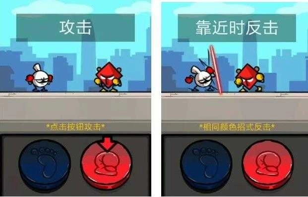 3、每场战斗都由你率先发起攻击,之后便轮到敌人行动;防御时需留意敌人的颜色攻击提示,选择对应颜色的招式来完成防御与反击。以下图为例:当屏幕上出现蓝色感叹号提示时,快速点击蓝色按钮就能成功防御敌人的此次攻击。