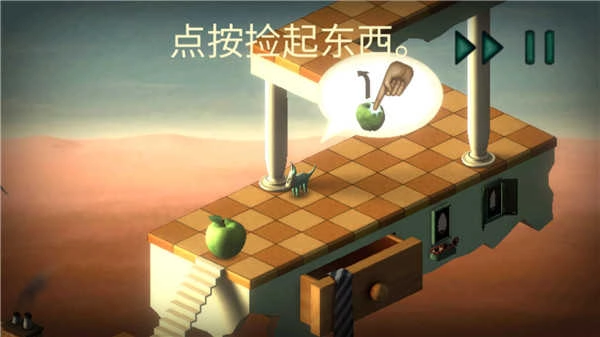 然后取来另一个苹果,把其中一个苹果放置在图示位置,引导主人公向下移动过去。等角色的行动方向改变后,立刻将苹果放到指定位置就能通关了。