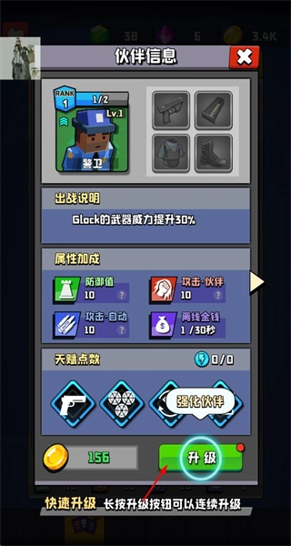 3、在伙伴信息界面,消耗金币升级伙伴,提升其属性加成,强化战斗能力;也可解锁天赋进一步增强伙伴效果。