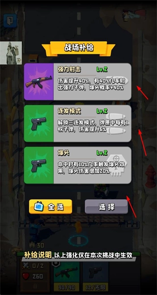4、选择战场补给技能,点击选择或全选装备这些增益效果,在关卡中提升射击伤害、攻击效率等,增强闯关优势。