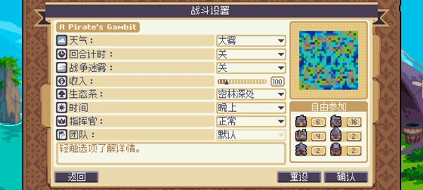 4、选好后进行战斗设置,玩家可设置游戏内天气,时间等选项;