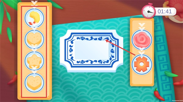 1、食材摆盘时,左右两侧的食材栏分别放置着各类食材,红箭头会指向中间的青花瓷摆盘区域,你需要按照指引将食材放入对应的指定摆盘位置。