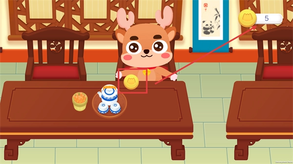 2、小鹿在餐桌旁就座后,红箭头会指向它旁边的金币,待完成用餐服务即可收取该金币。