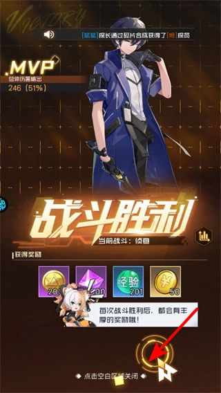 3、战斗胜利后,点击空白区域关闭结算界面,这是结束当前战斗流程的操作,可推进后续游戏环节。