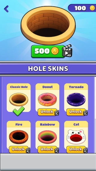 4. 在游戏商城里,玩家能够花费金币解锁各式各样外观的黑洞皮肤,换上你心仪的黑洞皮肤,继续你的闯关之旅吧!