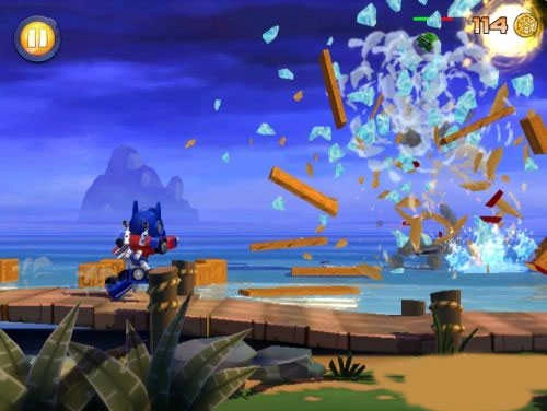 4、操控变形金刚鸟在跑酷时射击,消灭躲在障碍物种的机械猪。