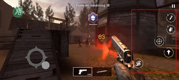 5、通过右边的按键来查看血量、手雷、进行瞄准、跳跃、换弹按钮等。