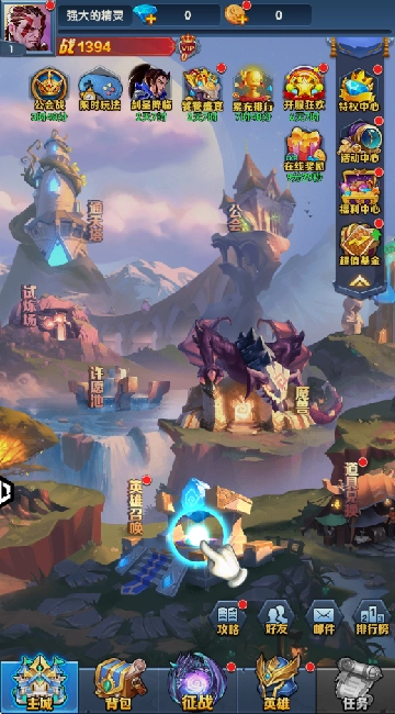 2、根据指引来到英雄召唤,没有帮手可不行,你需要不停收集英雄陪你战斗。