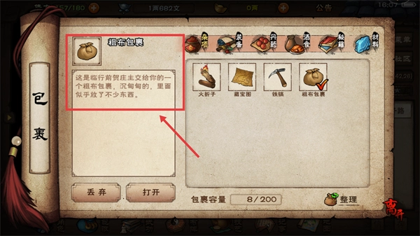 1、开启【粗布包裹】以获取【火折子】、【藏宝图】、【铁镐】等道具,为后续的探索行动与任务推进完成前期筹备工作。