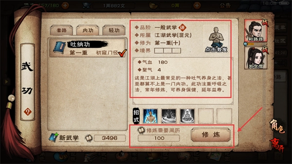 2、修炼【吐纳功】能够提升气血与聚气属性,强化角色的基础能力,为应对后续的战斗和剧情挑战提供助力。