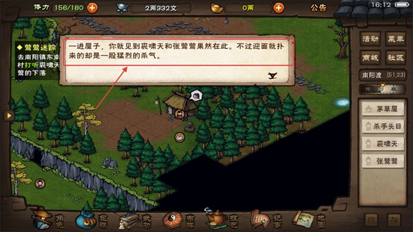 4、进入【茅草屋】后会见到【裘啸天】和【张莺莺】,留意到迎面而来的杀气,需提前做好战斗应对准备。