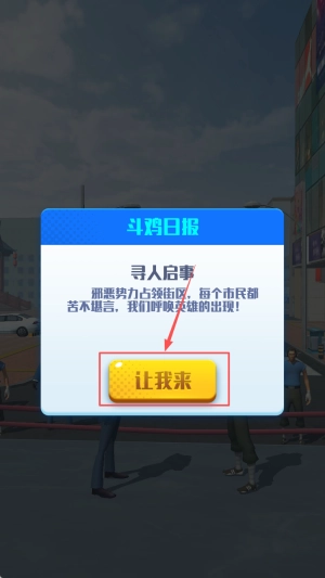 1、接受任务:在游戏主界面,点击“让我来”按钮,接受斗鸡日报发布的寻人启事任务。