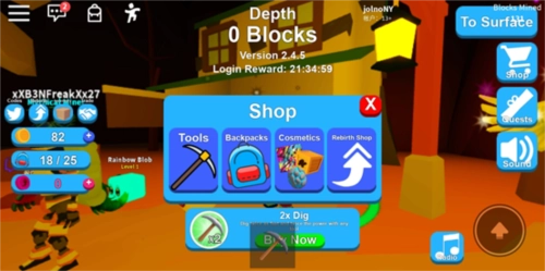 当积累了一定数量的金币后,我们就可以找带有购买标识的商人进行采购啦!踏入黄色圆圈区域,商店界面便会弹出,里面有工具、背包、装扮(能买到发型、宠物之类的物品)和重生商店(可购置部分道具)这四个分类。前期重点是入手更高级的工具和背包,如此一来就不用频繁返回地面,能提升挖矿(获取金币)的效率~有了高级道具,我们就能慢慢深入地下更深处挖矿,能挖到更优质的物品,要是运气不错还能挖到金箱子、钻石等,但相应地,所需的挖矿工具等级也会很高!