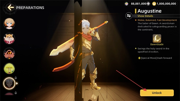 2、在游戏角色准备界面,选择角色定位为近战、平衡型、发育较快的剑士,点击右侧的Unlock按钮可购买使用该角色。