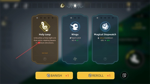 4、角色等级提升后会进入技能选择界面,此时选择金色技能,即可释放圣光球并朝随机方向发射旋转光束,从而搭配出适配战斗的策略。