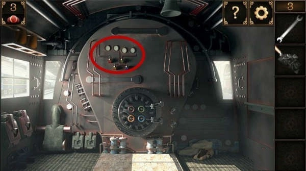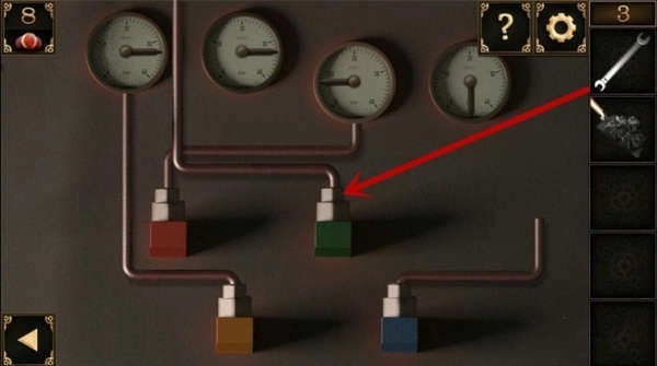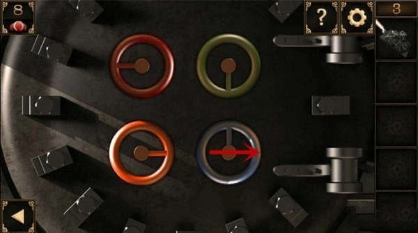 7、接着点击阀门,其上方设有四个不同颜色的把手,依据此前获取的提示来调整把手位置(红色把手调至左侧,绿色把手调至下方,橙色把手调至右侧,蓝色把手调至右侧)。