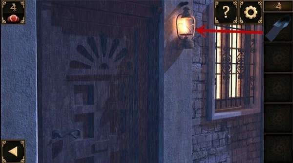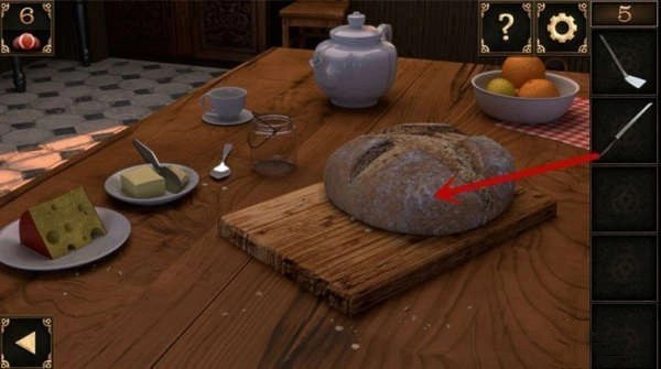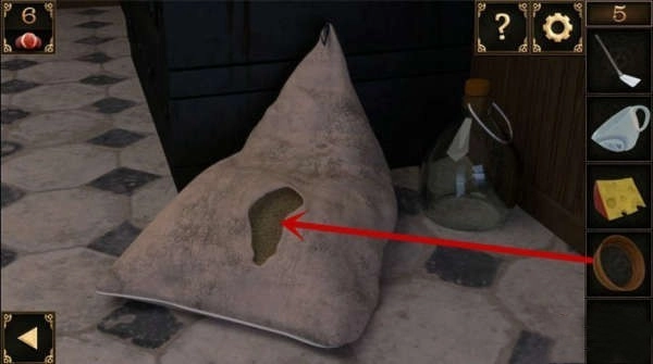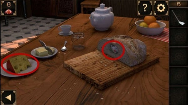 10、窗户下方有个洞口。先把装有锅铲的大碗摆在洞口前,接着把奶酪搁在锅铲上,洞里贪吃的老鼠就会掉进陷阱,被大碗罩住,之后就能拿走洞里的钥匙了。