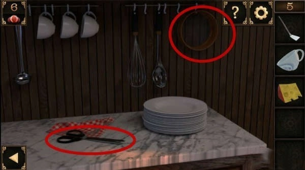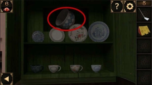 8、用钥匙打开门右边的橱柜,将之前收集到的杯子放上去,调整盘子和杯子的顺序如上图所示,即可得到一个大碗。