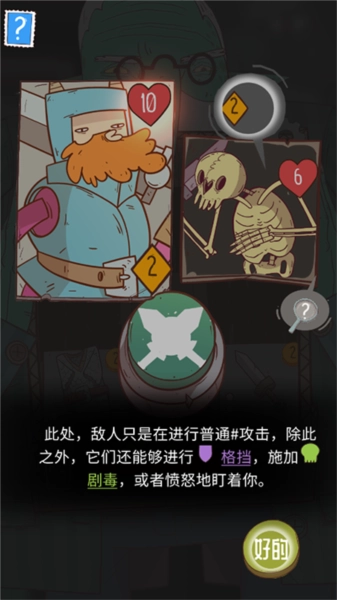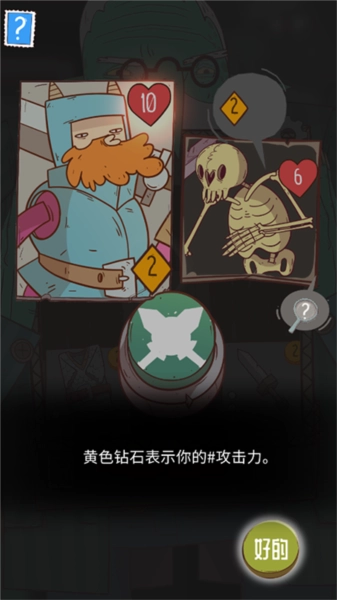 5、爱心图标对应生命值,黄色图标对应攻击力,绿色按钮的功能是发起进攻。