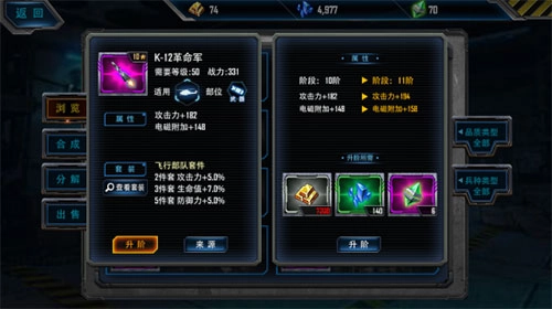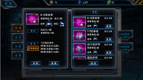 装备初始都是1星的,可以花费金条或者精炼石进行升阶操作。操作成功后,装备星级也跟随提升。每提升一星,带来的属性加成都十分可观哦。看小编下图中的抢先版体验图,K-12革命军已经升到了10星,战斗力那是各种爆表啊!羡慕吗,那就让我们期待下次测试快点到来吧。