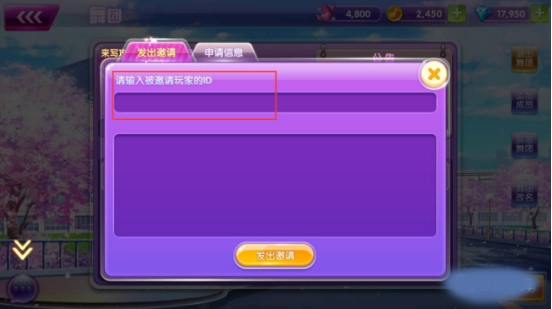 4、点击“发出邀请”,输入玩家ID后点击发出即可。在旁边的申请信息里,能看到想要加入舞团的玩家!团长可通过选择“同意”或“拒绝”,来决定是否允许该玩家加入舞团!