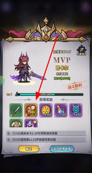 战斗胜利后,系统会展示MVP角色以及本次获得的奖励,奖励内容涵盖装备、资源等;点击“确定”按钮即可领取这些奖励,进而继续推进后续的游戏进程。