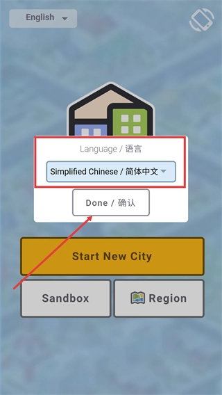 1、选择【Simplified-Chinese-简体中文】后点击【Done-确认】按钮,接着进入【Start-New-City】创建专属于你的新城市,开启城市建设之旅。