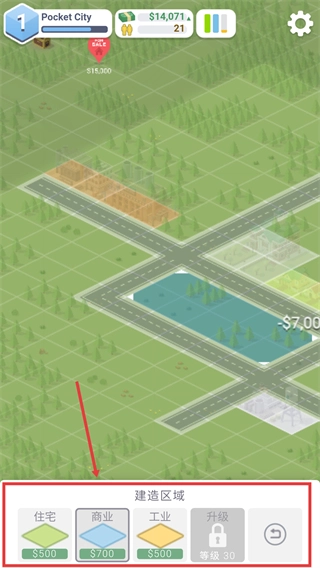 3、在【建造区域】界面依次选择【住宅】、【商业】、【工业】类型,结合预算规划布局,逐步扩大城市规模。