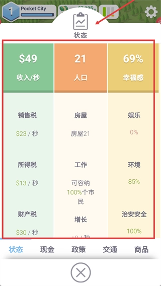 4、点击【状态】界面,查看【每秒收入】【人口数量】【居民幸福感】相关数据,据此调整策略,以提升城市的整体运营效率。