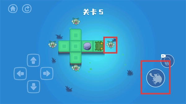 2、进入【关卡5】后,用方向键操控青蛙移动,首先向右移动去靠近右侧的昆虫,这样才能够触发捕食操作哦。