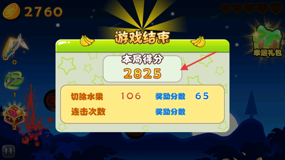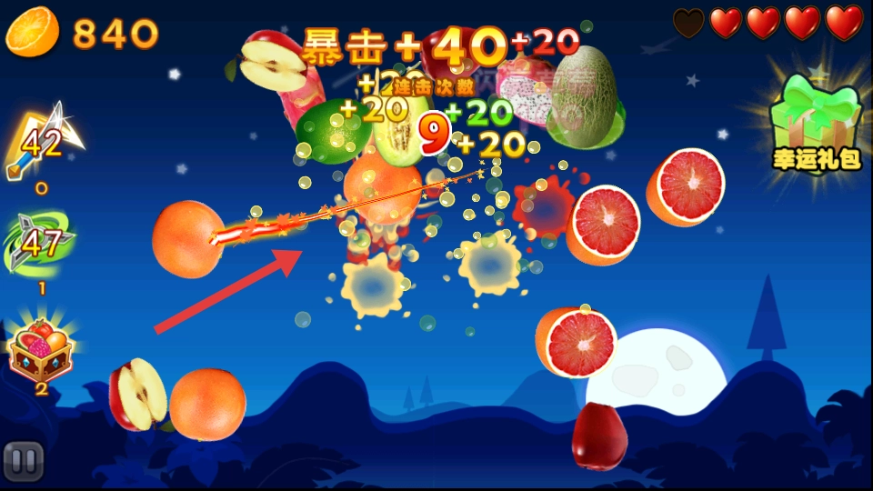 3、切水果时,连点,触发暴击、连击,加分多,躲红炸弹。