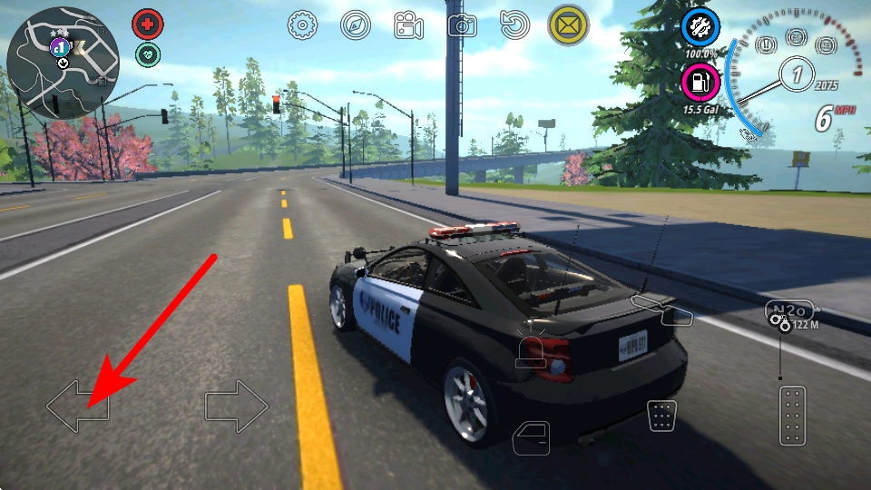 1、驾驶警车时,点击红色箭头指向的左方向键,调整车辆行驶路线,在道路上完成转向操作,适应世界的路况变化。