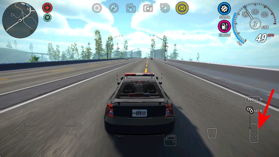 2、后续点击红色箭头指向的油门按钮,提升警车行驶速度,快速向任务目标区域移动,推进开放世界的探索进度。