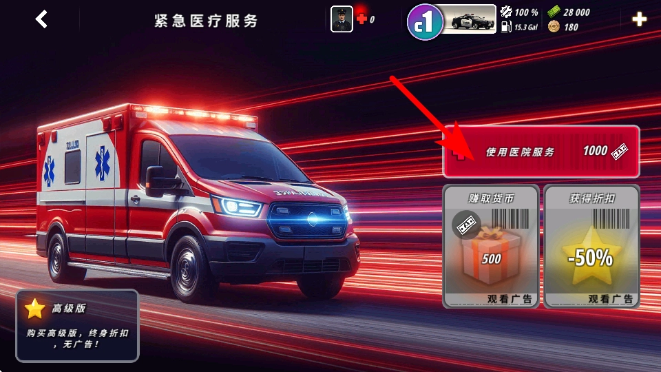 3、若角色状态不足,进入紧急医疗服务界面后,点击红色箭头指向的使用医院服务按钮,为后续任务做准备。