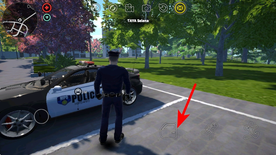 4、完成状态恢复后,点击红色箭头指向的车辆交互按钮,重新进入警车驾驶模式,继续在开放世界中执行任务。
