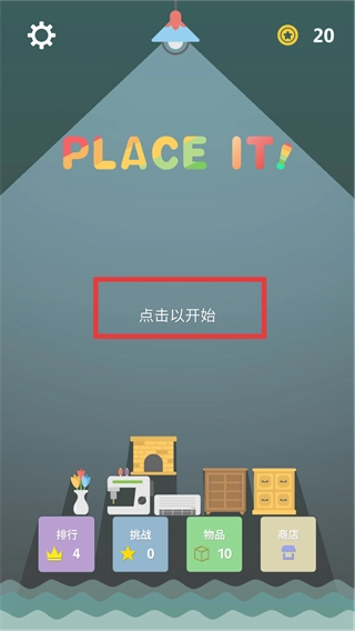 1、在【PLACE-IT!】的主界面中,点击【点击以开始】按钮,即可进入游戏的物品堆叠关卡。