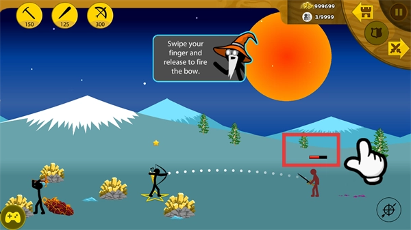 2、战斗过程中请留意【Swipe-your-finger-and-release-to-fire-the-bow.】的提示,通过滑动手指并松开的方式来发射弓箭,以此攻击敌方目标。