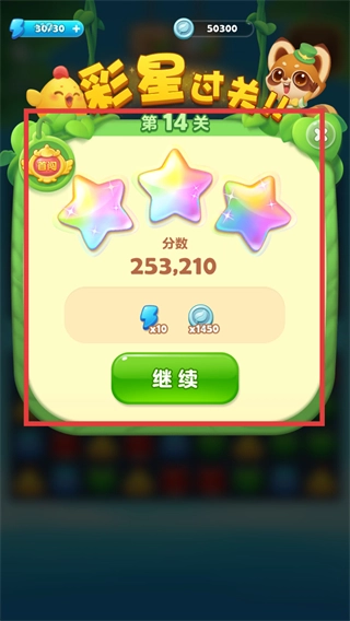 4、通关后获得彩星过关,分数达253210,需合理规划步数与道具,才能轻松拿到三星评价。