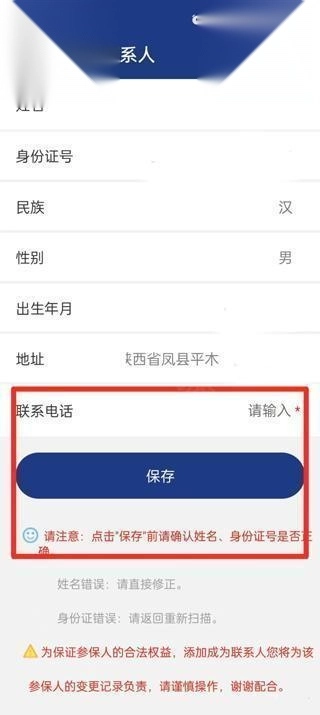 将身份证正面放入框内,完成身份证照片采集。完成身份证扫描后进入添加联系人页面,填入联系电话,点击保存,按照提示完成绑定