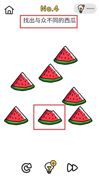 1、找到【与众不同的西瓜】这一关卡,认真察看六块西瓜的各个细节之处,把被咬过的那块找出来并进行点击,就能成功通过这一关卡。